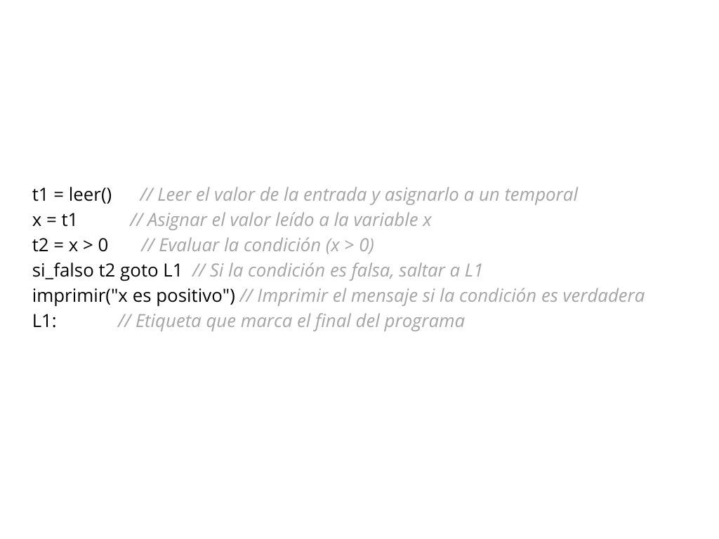 En el caso del programa en español inspirado en C (ver Figura 2), la fase de generación de código intermedio descompone las instrucciones del código fuente en operaciones simples, siguiendo una representación abstracta e independiente del hardware. Este formato facilita tanto la optimización como la posterior traducción al código máquina.